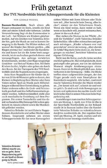 Nordwohlde. Am Montag, den 25. März und 1. April, bot Valentina Bründer jeweils erste Schnupperstunden für den neuen TVE-Kurs "nappydancers" an. Sechs kleine Mädchen und Jungen im Alter von eineinhalb bis ca. drei Jahre machten an der Hand ihrer Mama fleißig mit.