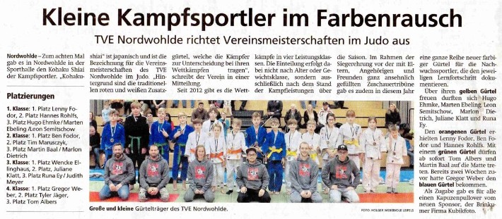 Über ihren gelben Gürtel freuen durften sich Hugo Ehmke, Marten Ebeling, Leon Semitschow, Marlon Dietrich, Juliane Klatt und Runa Ey. Den orangenen Gürtel erhielten Lenny Fodor, Ben Fodor und Hannes Rohlfs. Mit einem grünen Gürtel dürfen ab sofort Tom Albers und Martin Baal auf die Matte treten. Bereits zwei Wochen zuvor hatte Gregor Weber den blauen Gürtel bekommen.